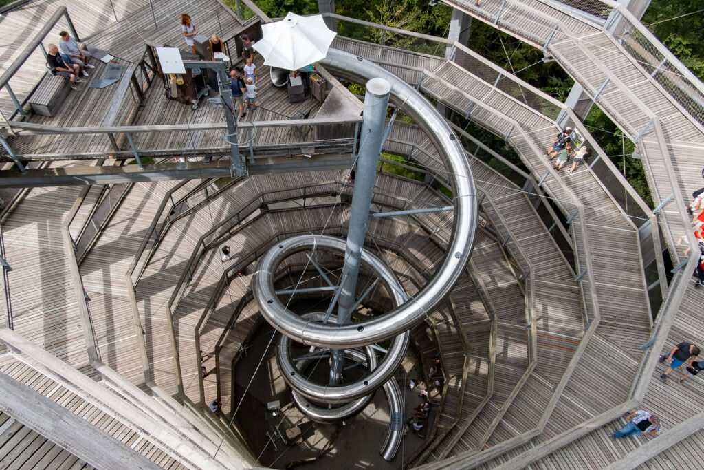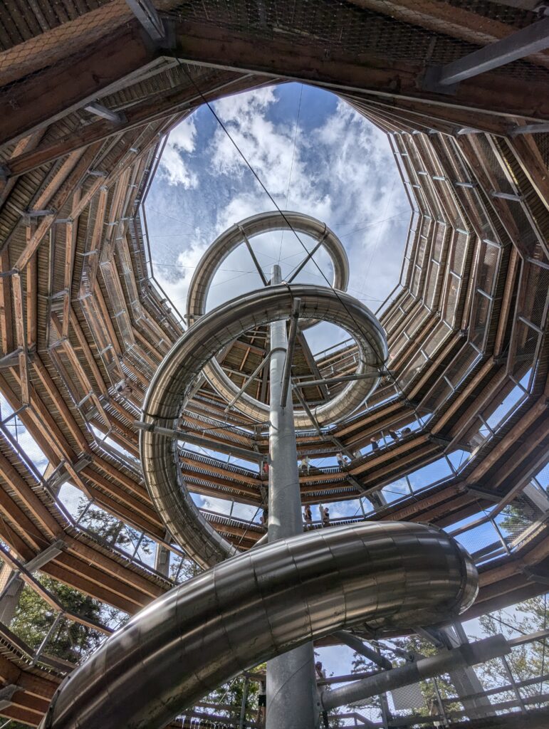 The tower is mainly made of wood and looks like a large twisted cup due to the arrangement of the twelve double-inclined, layer-glued main supports. The columns are set up at the same distance from each other in a rotationally symmetrical manner and are inclined both outwards and clockwise. They are connected by steel pipes, cross-braced several times and partly protected against the weather by sheet metal cladding. At a height of 25 metres, between the access ramp and a tubular steel column in the middle of the tower, there is a triangular platform, from which a 55 metres long tunnel slide leads to the ground in several turns within the tower.