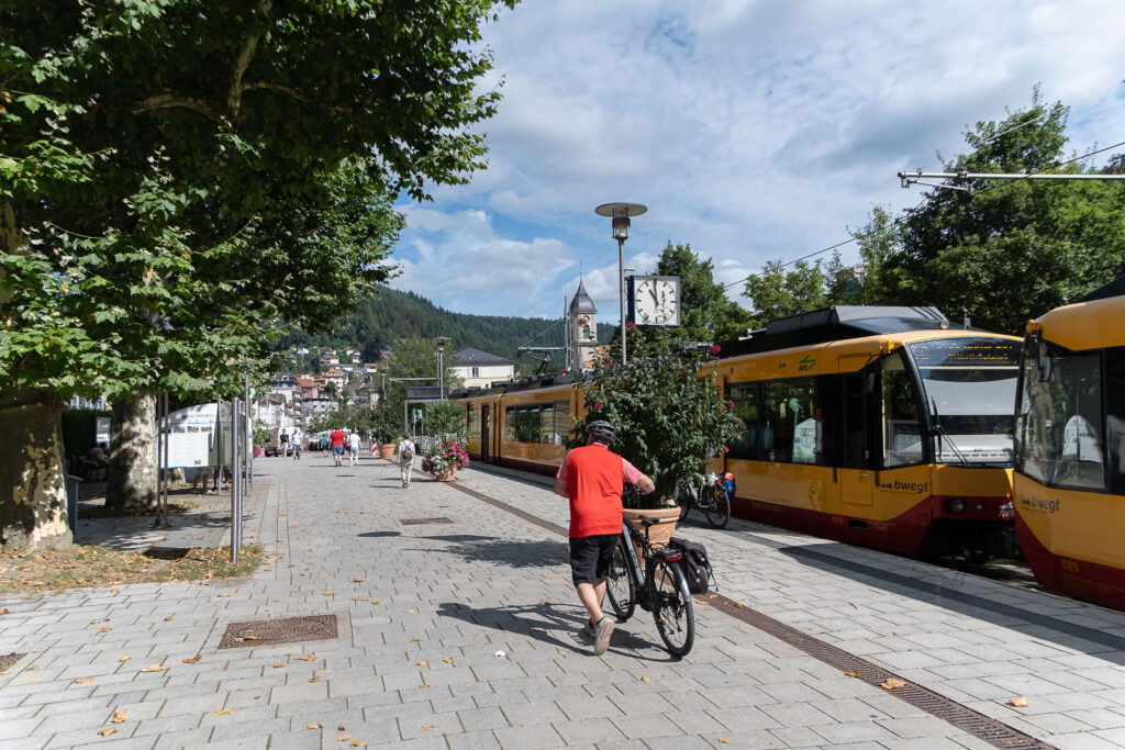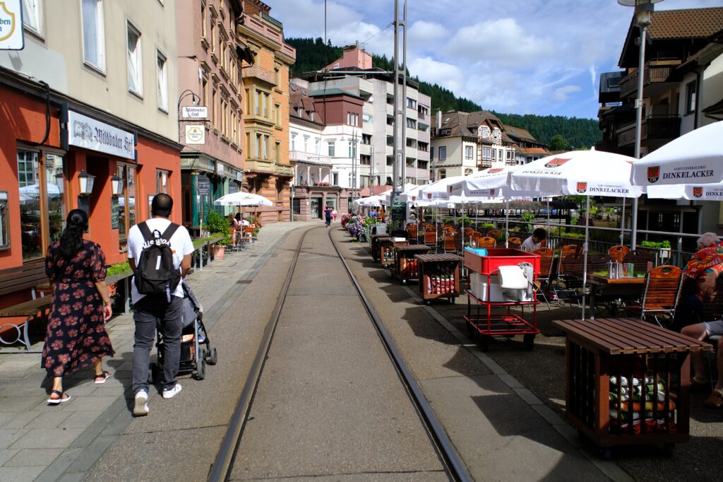 We can get down at Bad Wildbad Bf or the last stop Bad Wildbad Kurpark. For those looking to grab the funicular train (Sommerbergbahn), the last stop is recommended. Once we are about to reach the station, we see that the railway track passes through the shopping street which reminisces the shopping street in Vietnam.