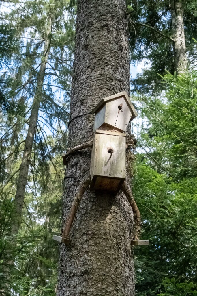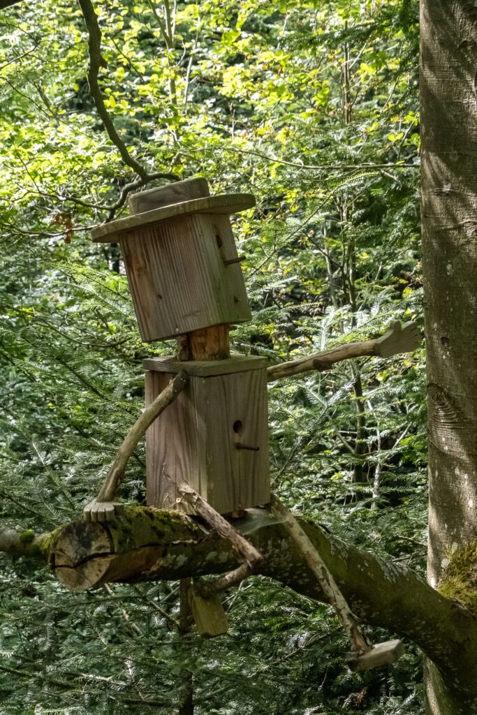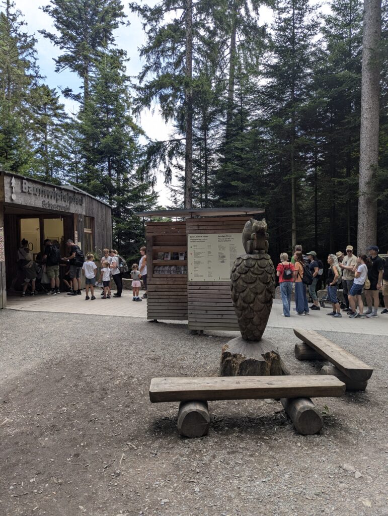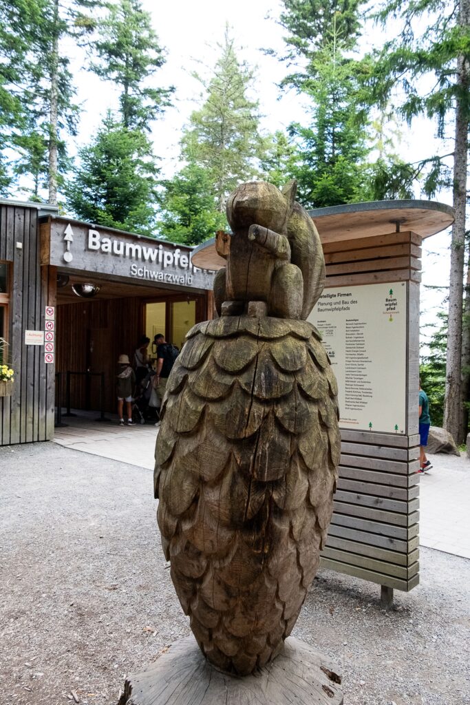Just a short walk from the top station of the Sommerbergbahn is the Tree Top Walk (Baumwipfelpfad), a unique attraction that lets you experience the forest from a bird’s-eye view. This elevated pathway, stretching 1.25 kilometres, meanders through the treetops at heights of up to 20 meters, offering unparalleled views of the surrounding landscape. At the entrance is a wooden carving of a squirrel sitting on a large nut.