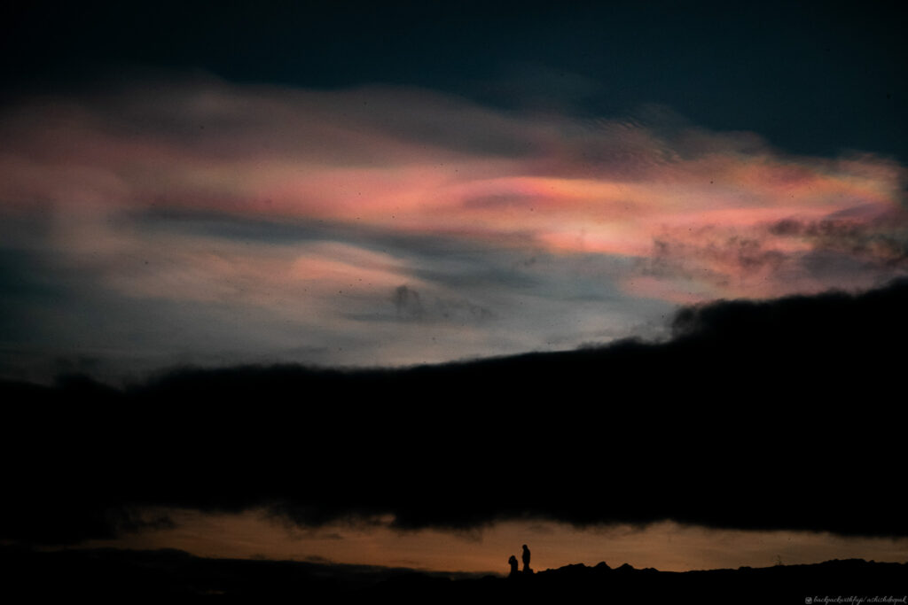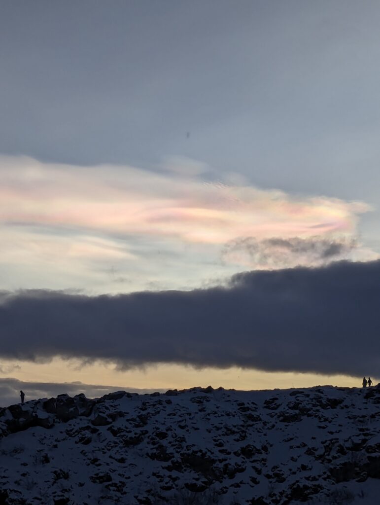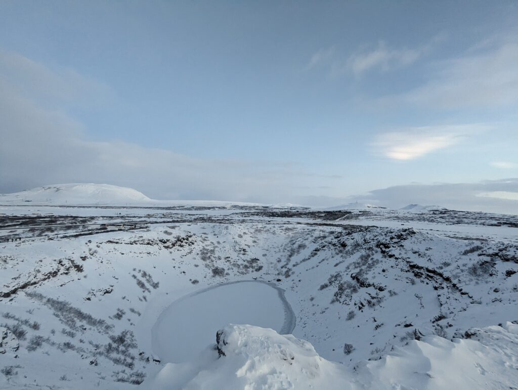 The first stop for the day was Kerid Crater. An extinct volcanic crater which turns into a frozen lake in Winter and a stunning blue lake in the summer. We were given 45 minutes to explore the crater. You can walk along the perimeter of the volcano or even climb down to the lake below. The day before I had seen photos of Nacreous clouds (ice polar stratospheric clouds) on Instagram from a user in Alaska. On a cold day in Iceland climbing the crater, nature gifted everyone with the distinct pink clouds. I was lucky enough to enjoy it and capture the same.