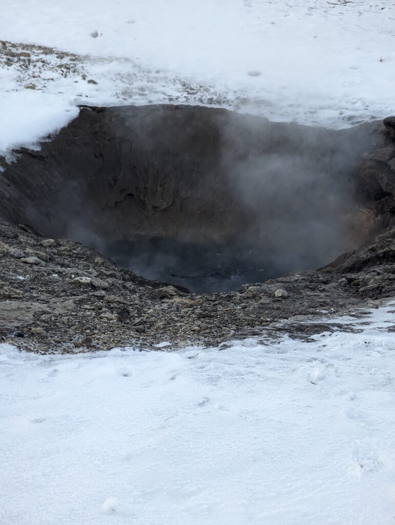 After taking in the view of the massive waterfall, our next stop was 10 minutes away- The Geysir Centre. The English word Geyser is derived from Geysir. As you approach the Geysir, the air fills up with a pungent smell of sulphur. The famous Geysir is “The Great Geysir” which used to erupt up to 60ft up in the air. This Geysir erupts less frequently. A nearby geyser named Strokkur now erupts more frequently and shoots hot water up to 35ft up in the air. There are around thirty much smaller geysers and hot pools in the area, including one called Litli Geysir (‘Little Geysir’).