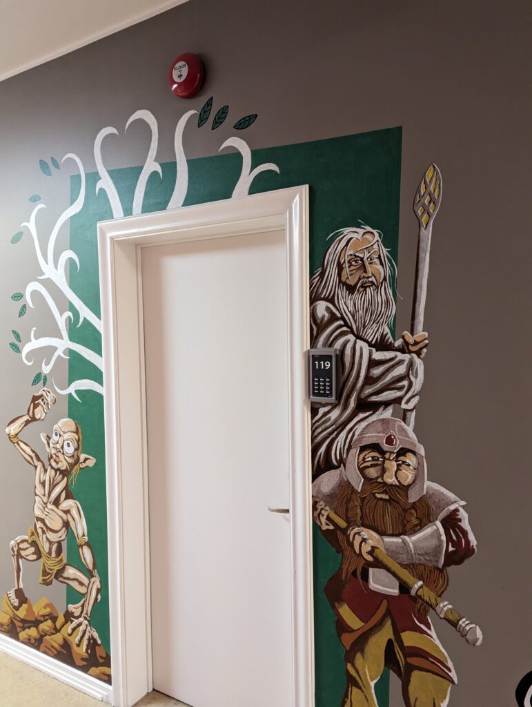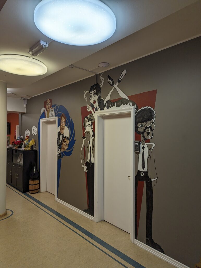 The hostel walls are nicely decorated with characters from classic movies.