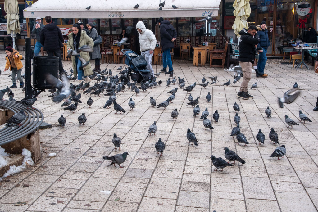 Historically there is a popcorn cart where a man sells unpopped corn kernels for 2 BAM (1 EUR). A better option is to buy grains from nearby shops which is cheaper and good for the pigeons.