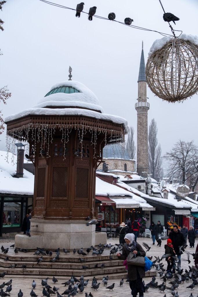 In the centre of the Baščaršija Square is Sebilj, an Ottoman-style wooden fountain from the 1700s. According to local legend, visitors who drink water from the fountain will return to Sarajevo someday. Behind the fountain is the famous Pigeon Square, where people can feed Pigeons.