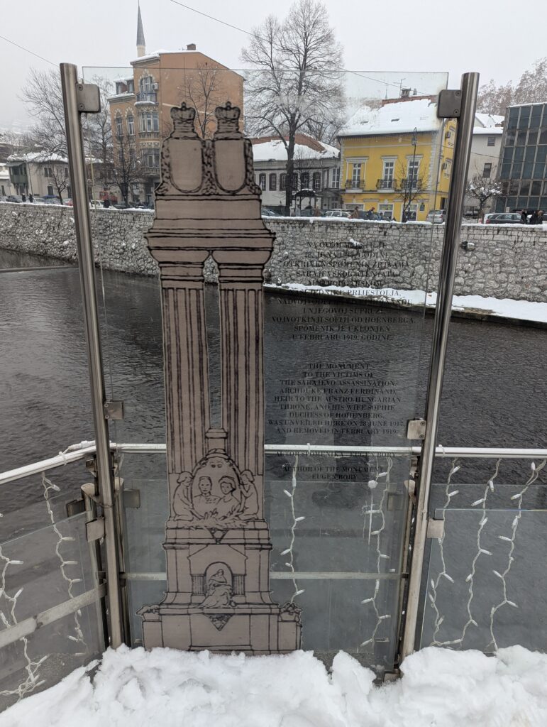 After crossing the bridge, on the right side of the road lies the famous spot from where Gavrilo Princip shot Archduke Franz Ferdinand and his wife. The location is marked with a footprint and a plaque.